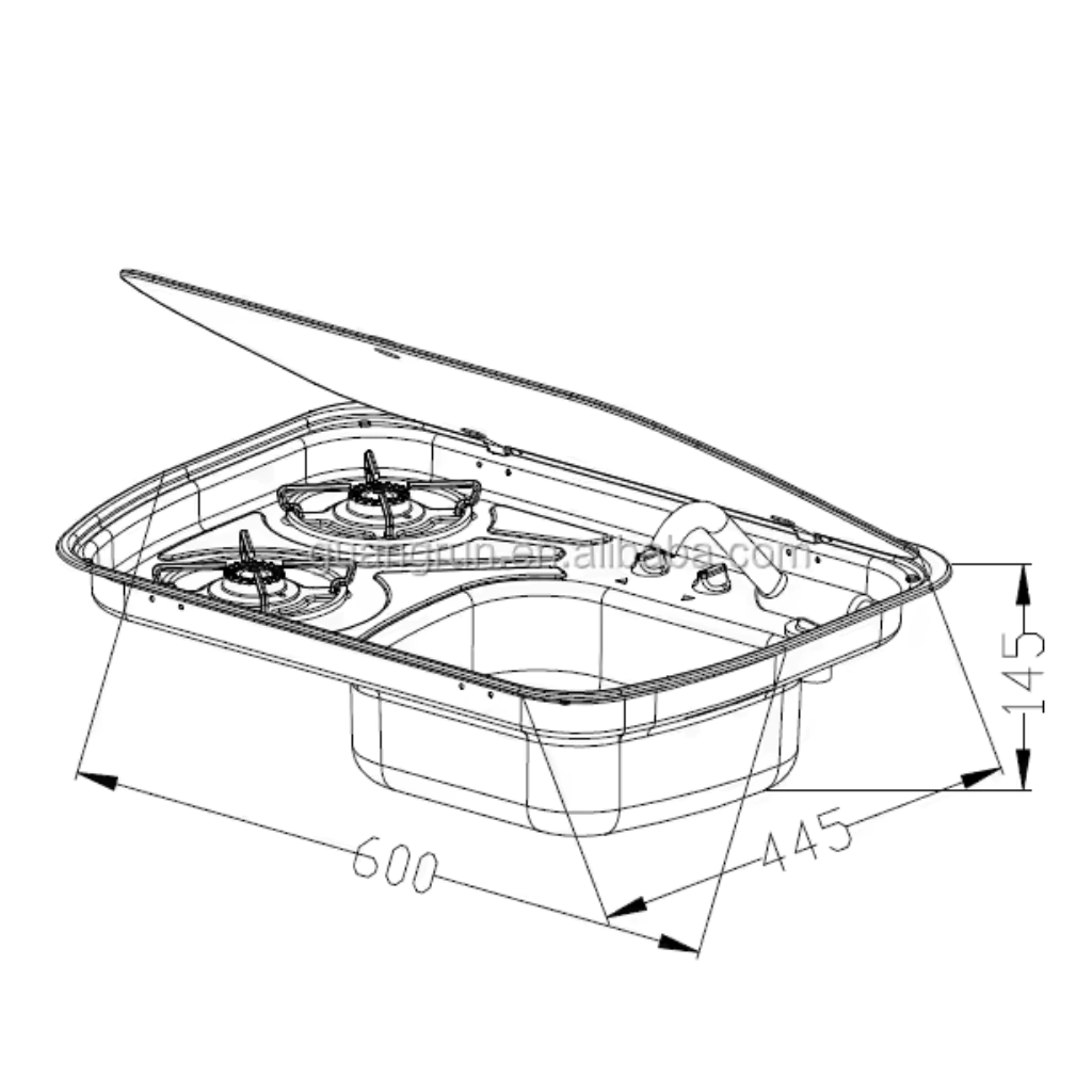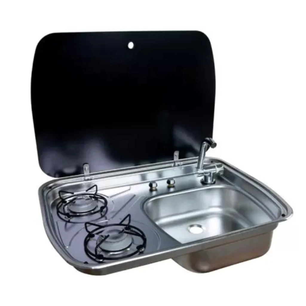 Fogão a gás 2 bocas e Pia com tampo de vidro preto e acendedor automático. Produto ideal para motorhomes e trailers, optimizando seu espaço, deixando o ambiente muito mais elegante.